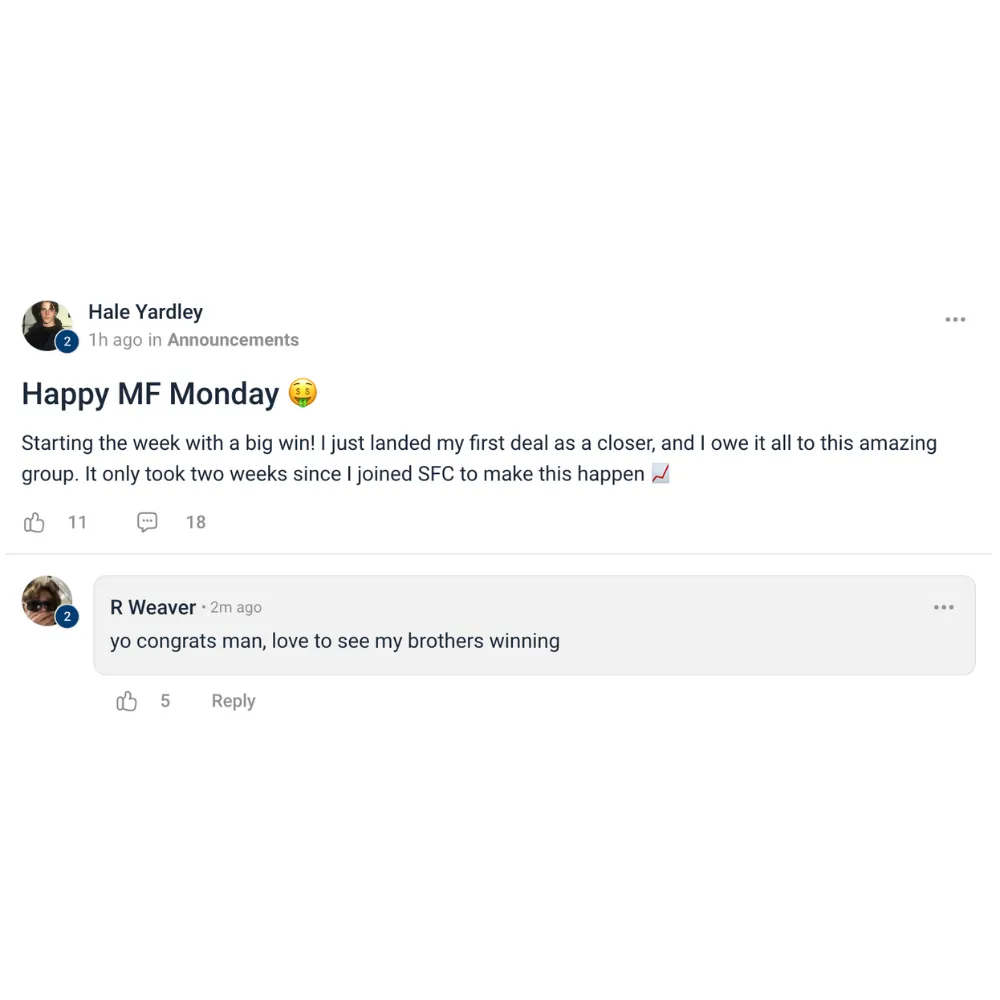 7-Week Closer is designed to help people of all experience levels. Our program includes comprehensive training, resources and the most robust sales community on the web to help you develop the skills and confidence you need to succeed in high ticket sales.